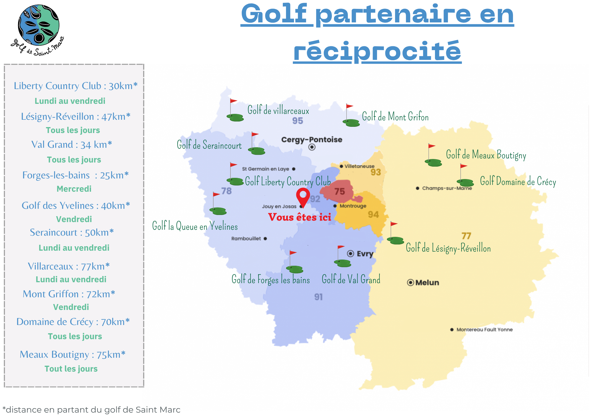 Nous sommes heureux d’offrir aux abonnés du Golf de Saint Marc des accords de réciprocité pour l’année 2025 avec le Golf du Liberty Country Club, le Golf de Lésigny-Réveillon, le Golf de Montgriffon, le Golf de Villarceaux, le Golf de Val Grand, le Golf de Forges les Bains, le Golf de Seraincourt, le Golf du Domaine de Crecy, le Golf de la Queue les Yvelines et le Golf de Meaux Boutigny.